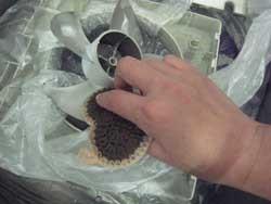 2) ビニールの袋に取り外したパーツを入れ、その中にお湯を入れて15分待ちます。熱湯につけることによって、こびりついた汚れが浮かんで掃除しやすくなります。いきなり重曹でお手入れすると汚れがこびりついていて落とすのに苦労するので、あらかじめお湯に15分 漬けるのがポイントです。