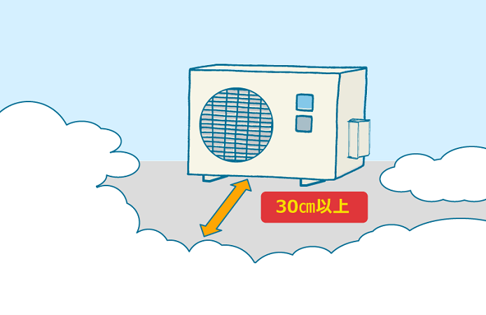 物を置いていなくても雪が積もって空気の吸い込み口や吹き出し口を塞いでしまうと、吸排気の妨げとなって故障の原因となる場合があります。空気の通り道を確保するために、室外機の周り30㎝に雪が積もらないようマメに除雪を行いましょう。多くの場合室外機の吹き出し口は前面に、吸い込み口が側面と背面にありますので前面だけではなく側面と背面も除雪を行うのがポイントです。また、毎年雪が降るような地域では高置台や防雪フードなどで室外機の周りに雪が積もらないような対策をするのもいいでしょう。