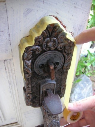 玄関ドアの塗装前にドアノブなどをマスカーテープで保護する